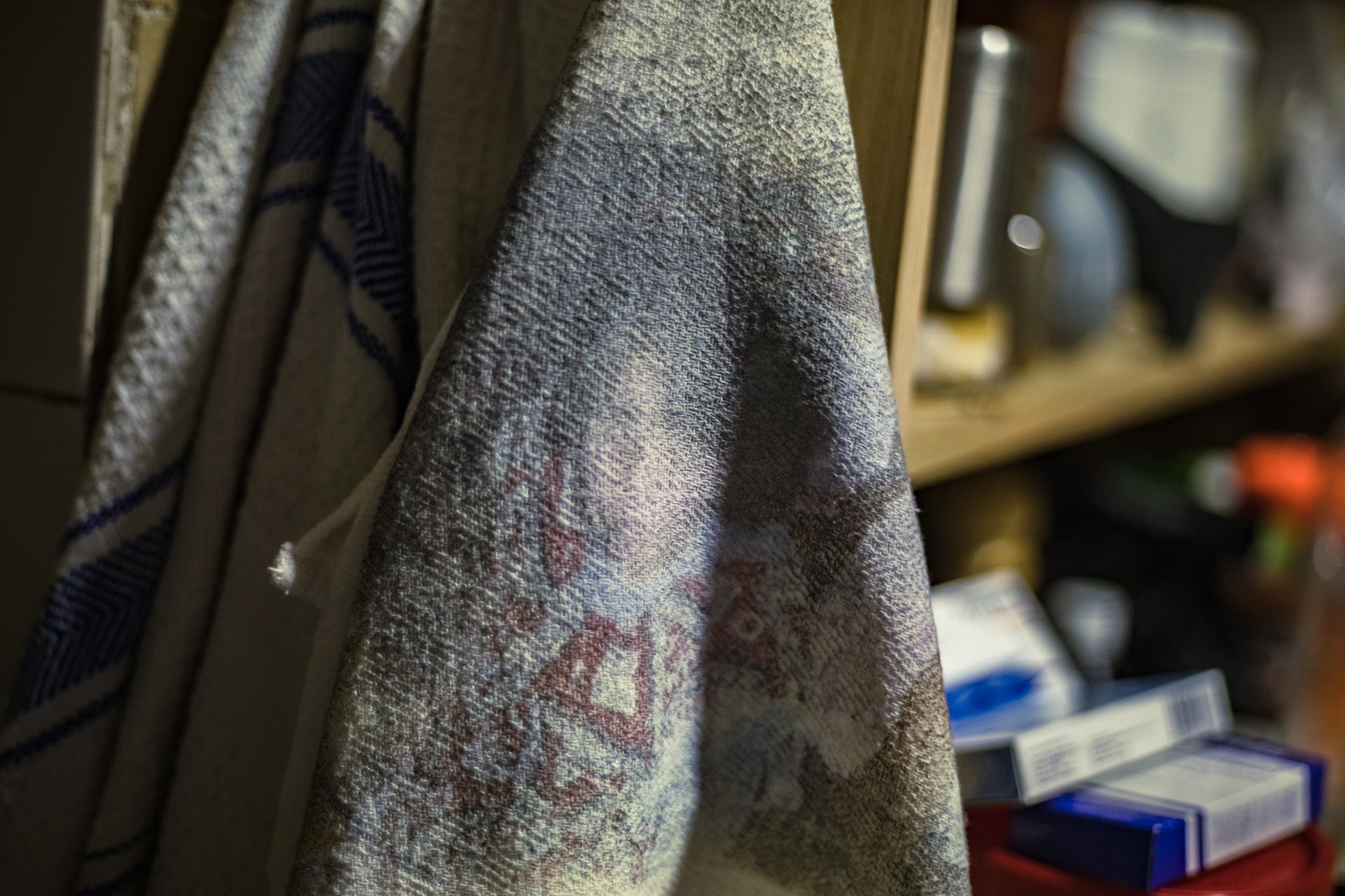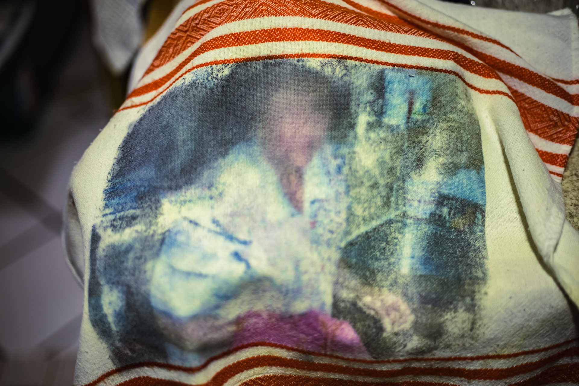 Al transferir las imágenes de mi abuela a estos objetos cotidianos y colocarlos en el espacio de la cocina, hago énfasis en su presencia y las tareas domésticas a las que se dedicaba en cada rincón de este espacio. Lo borroso de la imagen también refleja el paso del tiempo en mi abuela, quien dedicó gran parte de su vida a estas rutinas domésticas impuestas por los roles de género y la época en la que vivió. Ahora, estos trapos se convierten en depositarios tangibles de su vida cotidiana, impregnados de los recuerdos que dejó en este lugar.